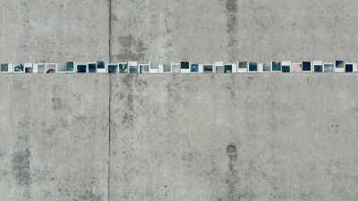 Sort of Optical Instrument (2023, Salzburg). A photo installation.The installation consists of cut Polaroids, depicting urban spaces alongside self-portraits, arranged closely together on a concrete wall. In this serial arrangement, a fragmented structure emerges, where urban space and the self form a shared narrative, while each individual fragment simultaneously evokes memory as a discontinuous, mosaic-like process.