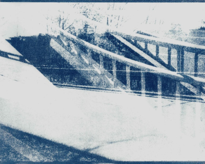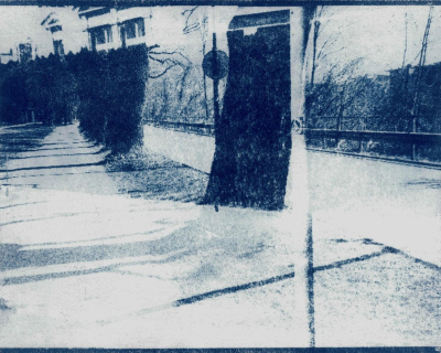 Step After Step After (2025, Salzburg).A series of 13 cyanotypes (on paper, 20,3 x 25,4 cm). The cyanotypes work through the deliberate layering of multiple exposures. Different moments of a walk converge within a single image, compressing time rather than representing it linearly. Spaces intersect, and scenes remain legible while resisting clear categorization. The series explores memory as stratification: past and present coexist simultaneously in the image without fully dissolving.
