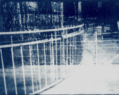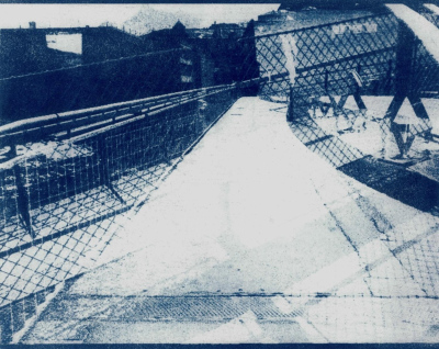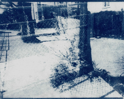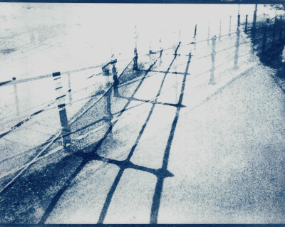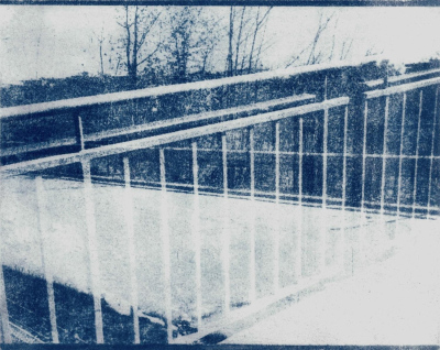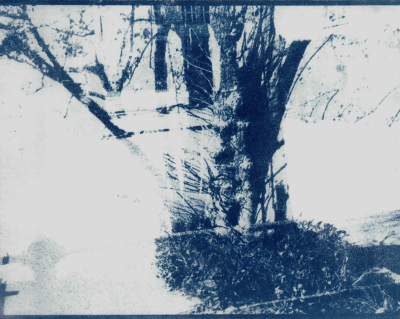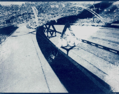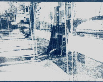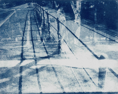 Step After Step After (2025, Salzburg).A series of 13 cyanotypes (on paper, 20,3 x 25,4 cm). The cyanotypes work through the deliberate layering of multiple exposures. Different moments of a walk converge within a single image, compressing time rather than representing it linearly. Spaces intersect, and scenes remain legible while resisting clear categorization. The series explores memory as stratification: past and present coexist simultaneously in the image without fully dissolving.
